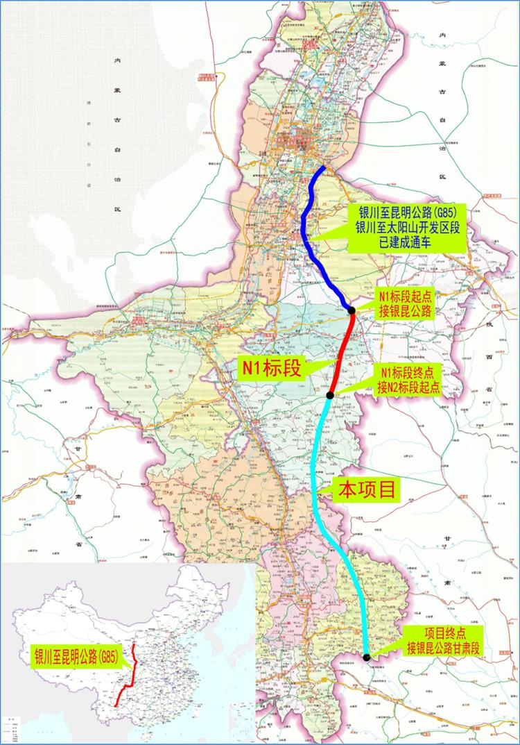 銀川至昆明公路(G85)起于寧夏銀川市,止于云南昆明市,全長2322km,是《國家高速公路網(wǎng)規(guī)劃》(2013-2030)南北縱向線中的一條,南北縱貫我國核心腹地,北接呼包銀榆、寧夏沿黃、陜甘寧經(jīng)濟區(qū),向南聯(lián)結(jié)關(guān)天、成渝經(jīng)濟區(qū)、滇中經(jīng)濟區(qū)和多個城市群,對我國西部內(nèi)陸地區(qū)經(jīng)濟社會發(fā)展的輻射帶動作用非常顯著。本次設計項目起點北接已建成通車的銀川至太陽山段,南接已開工建設的銀昆高速甘肅段,推薦方案路線全長236.781km,全線采用封閉式雙向四車道高速公路標準,設計速度100km/h,路基寬度為26m。中設設計集團寧夏院承擔N1標段設計任務,路線全長55.867公里,設置大中橋9座、互通式立交3處。