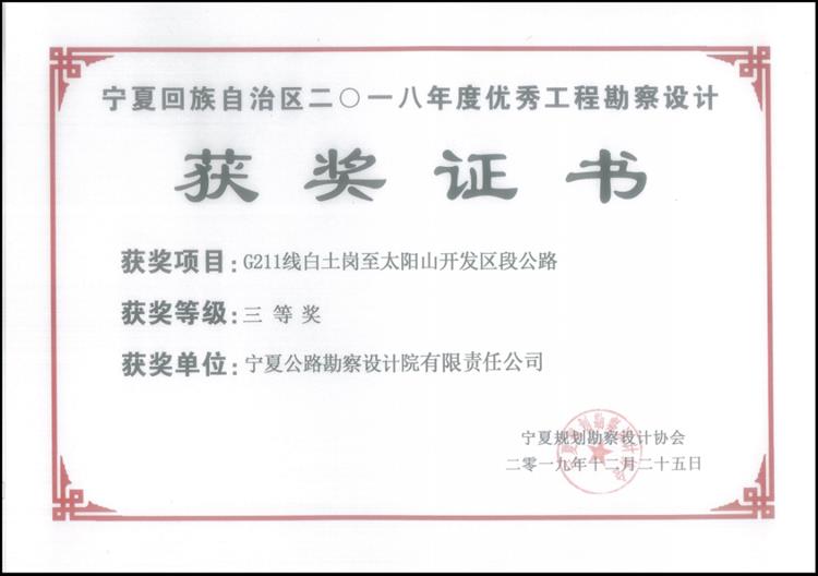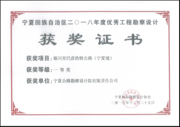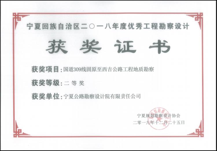 2020年4月30日,由寧夏規劃勘察設計協會組織的“寧夏回族自治區2018年度優秀工程勘察設計獎”評選活動結果揭曉。我院承擔的“銀川至巴彥浩特公路(寧夏境)”喜獲寧夏回族自治區2018年度優秀工程勘察設計一等獎,“國道309線固原至西吉公路工程地質勘察”喜獲寧夏回族自治區2018年度優秀工程勘察設計二等獎,“G211線白土崗至太陽山開發區段公路”喜獲寧夏回族自治區2018年度優秀工程勘察設計三等獎。