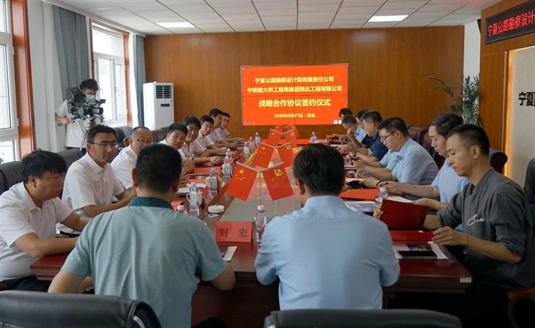 2020年8月27日上午,“寧夏公路勘察設計院工程技術實驗與研發基地”揭牌儀式及“寧夏公路勘察設計院與中鐵建大橋工程局集團西北工程有限公司戰略合作協議簽約儀式”在寧夏國運鐵建高新材料科技有限公司(寧夏院工程技術實驗與研發基地所在地)順利舉行。總經理趙旭東與中鐵建大橋工程局集團西北公司總經理赫宏偉代表雙方簽署了戰略框架協議。