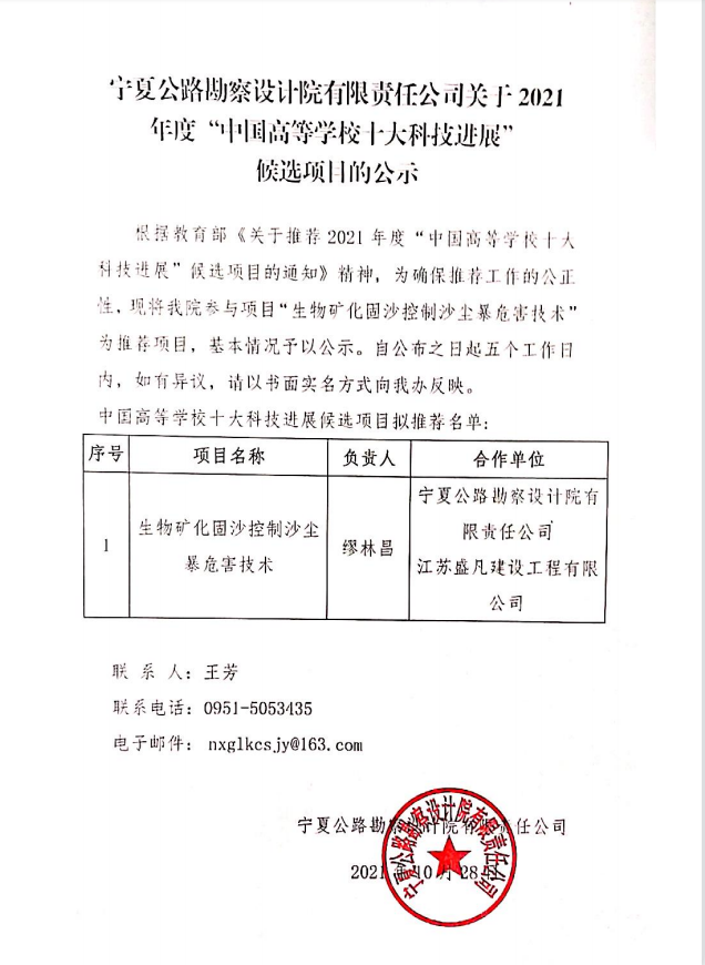 寧夏公路勘察設計院有限責任公司關于2021年度“中國高等學校十大科技進展”候選項目的公示