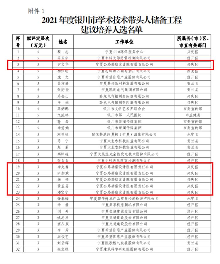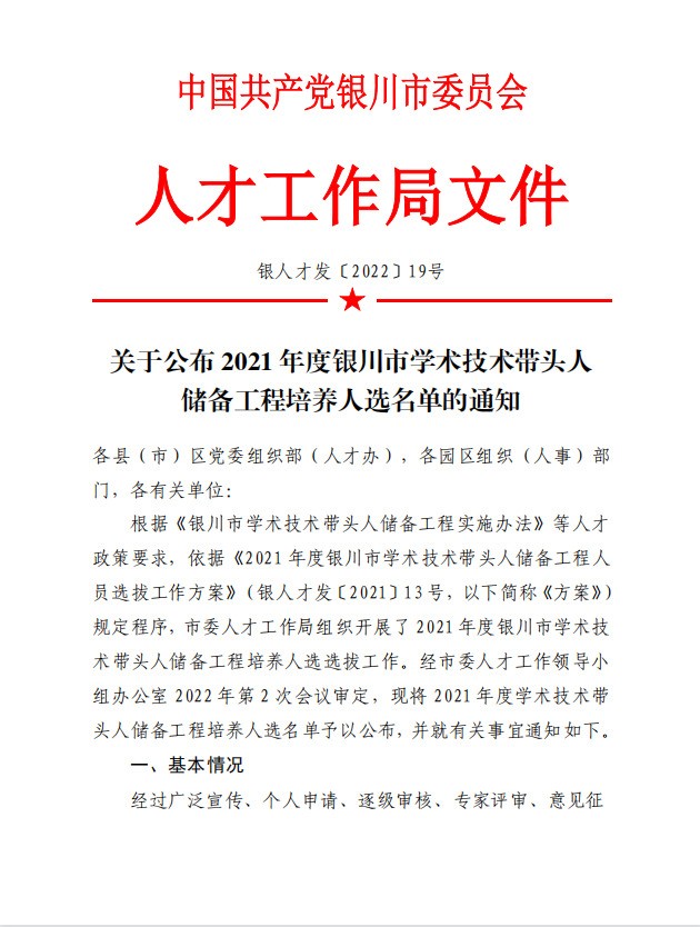 近日,中共銀川市委人才工作局公布了2021年度銀川市學術技術帶頭人儲備工程培養人選名單,寧夏院尹文華等6名同志成功入選。