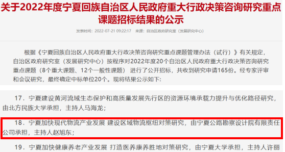 近日,寧夏公路勘察設(shè)計(jì)院有限責(zé)任公司成功中標(biāo)《寧夏加快現(xiàn)代物流產(chǎn)業(yè)發(fā)展,建設(shè)區(qū)域物流樞紐對(duì)策研究》課題項(xiàng)目,該項(xiàng)目是自治區(qū)政府研究室2022年度寧夏回族自治區(qū)人民政府重大行政決策咨詢研究重點(diǎn)課題之一,由自治區(qū)重大行政決策咨詢論證專家,寧夏公路勘察設(shè)計(jì)院黨委書記、總經(jīng)理趙旭東主持。