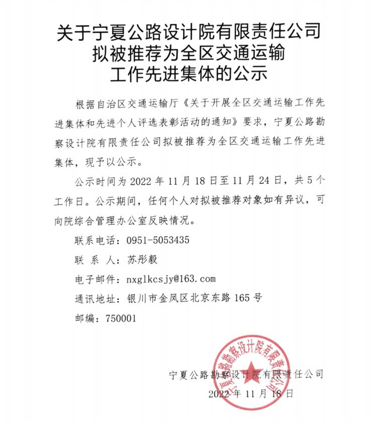 根據自治區交通運輸廳《關于開展全區交通運輸工作先進集體和先進個人評選表彰活動的通知》要求,寧夏公路勘察設計院有限責任公司擬被推薦為全區交通運輸工作先進集體,現予以公示。